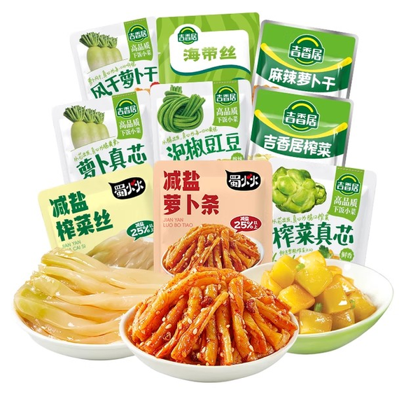 还在纠结吃啥配菜?吉香居咸菜组合搞定!任选6件下拉详情页加购不同sku到手14元,到手至多42袋下饭菜,精选原料,传统工艺腌制,榨菜、萝卜干、泡椒豇豆齐聚,鲜香爽辣,下饭超适合。